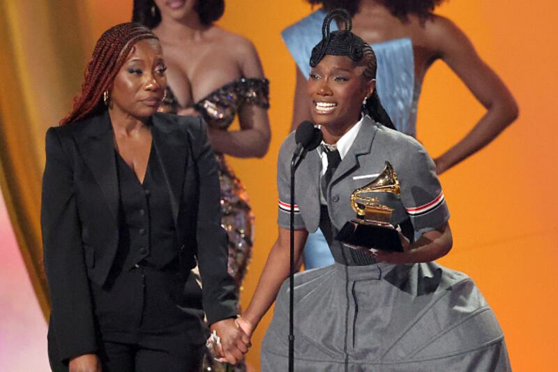67th GRAMMY Awards - Show LOS ANGELES, CALIFORNIA - FEBRUARY 02: (FOR EDITORIAL USE ONLY) Doechii (C) accepts the Best Rap Album award for "Alligator Bites Never Heal" from Cardi B onstage during the 67th GRAMMY Awards at Crypto.com Arena on February 02, 2025 in Los Angeles, California. (Photo by Amy Sussman/Getty Images) (Amy Sussman/Getty Images)