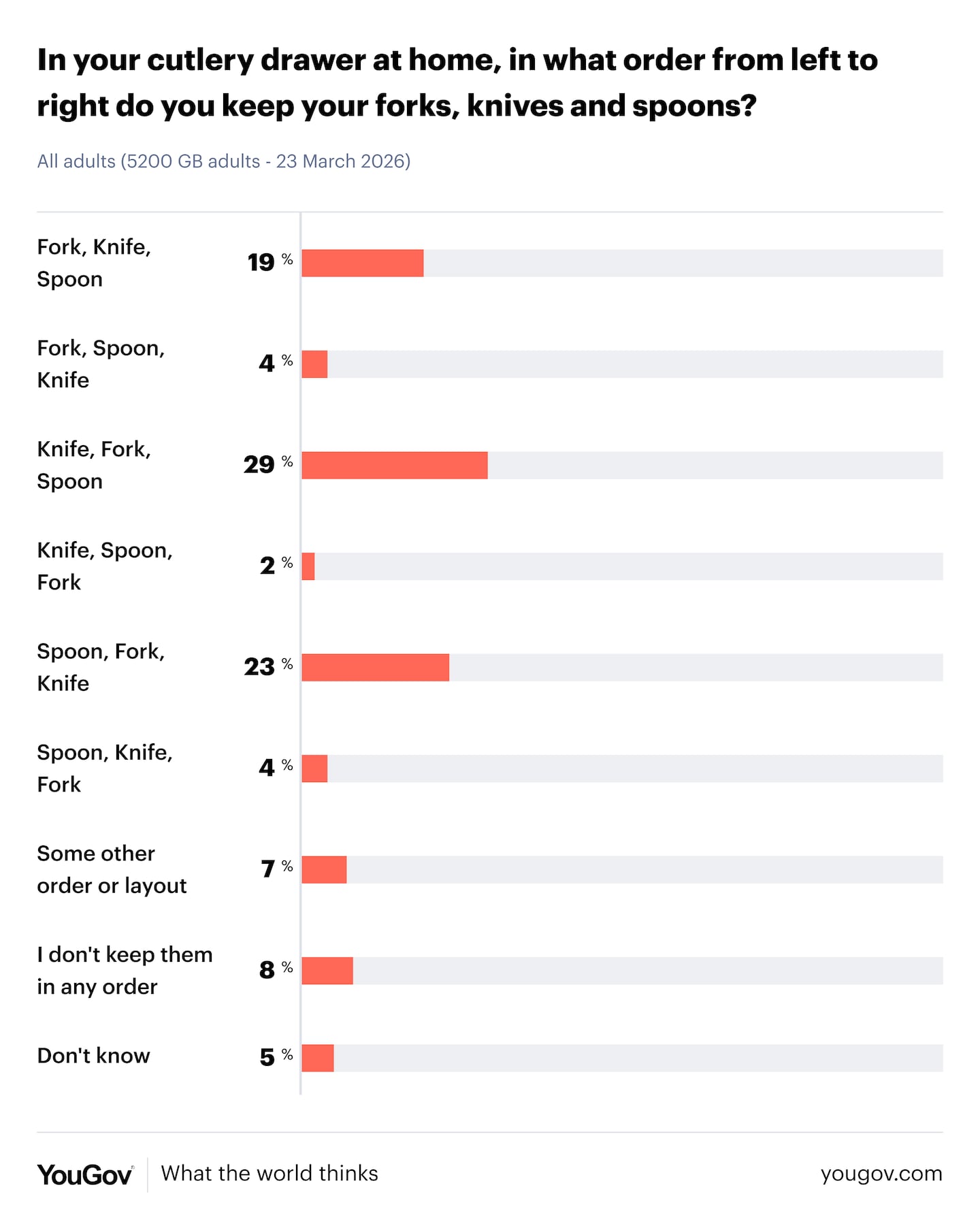 Well, the folks over at YouGov decided to settle the score once and for all by asking thousands of people exactly how they line up their silverware. It turns out, there is a “right way”, and a few slightly-less “right” ways.