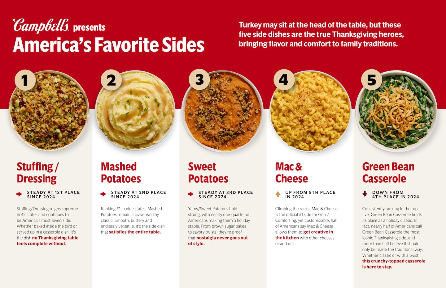 Campbell’s annual ‘State of the Sides Report’ found that 63% of Americans prefer eating side dishes over the turkey at Thanksgiving, and nearly half say that they would be happy with a plate full of sides without turkey at all!