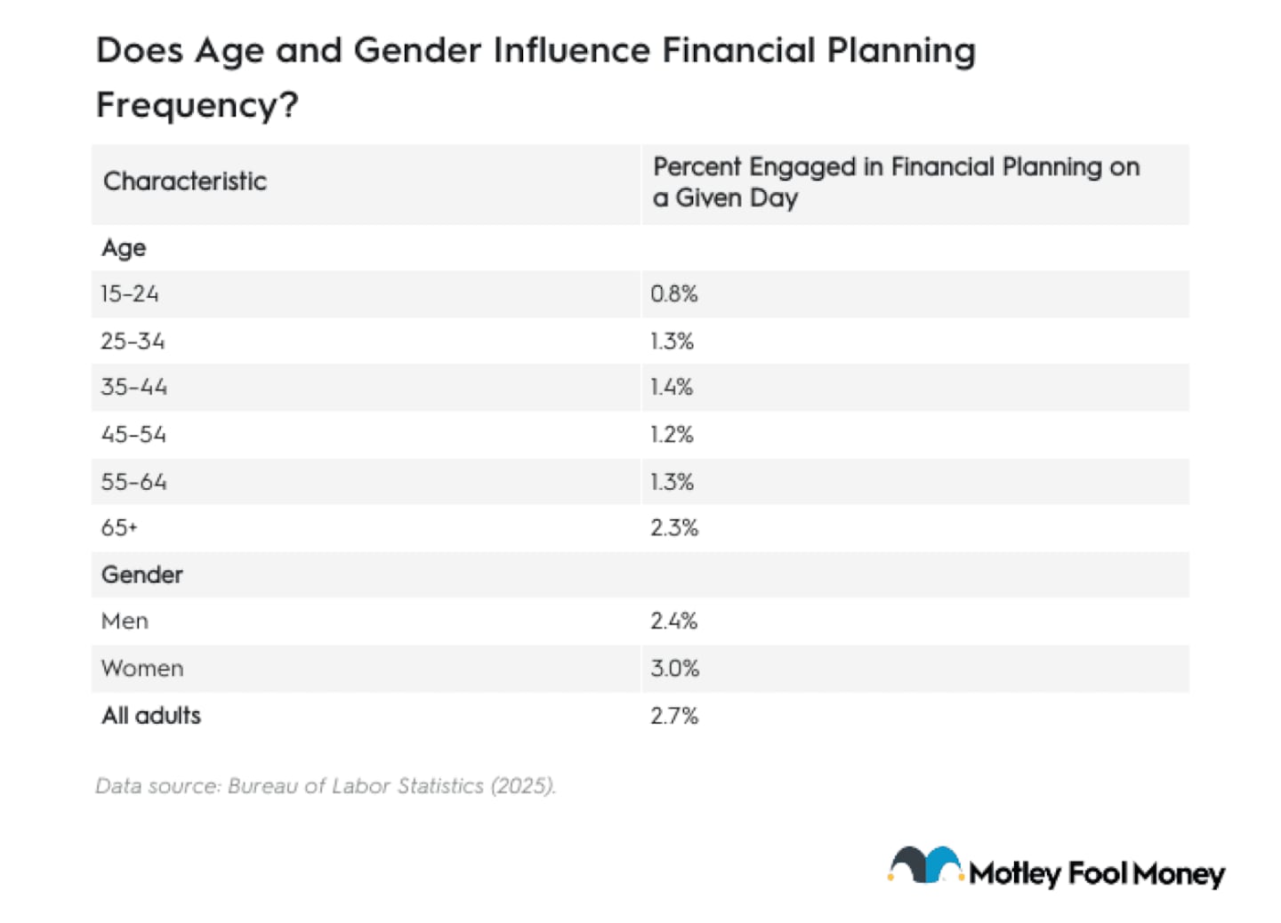 Financial planning engagement varies significantly by age and gender, according to BLS data.