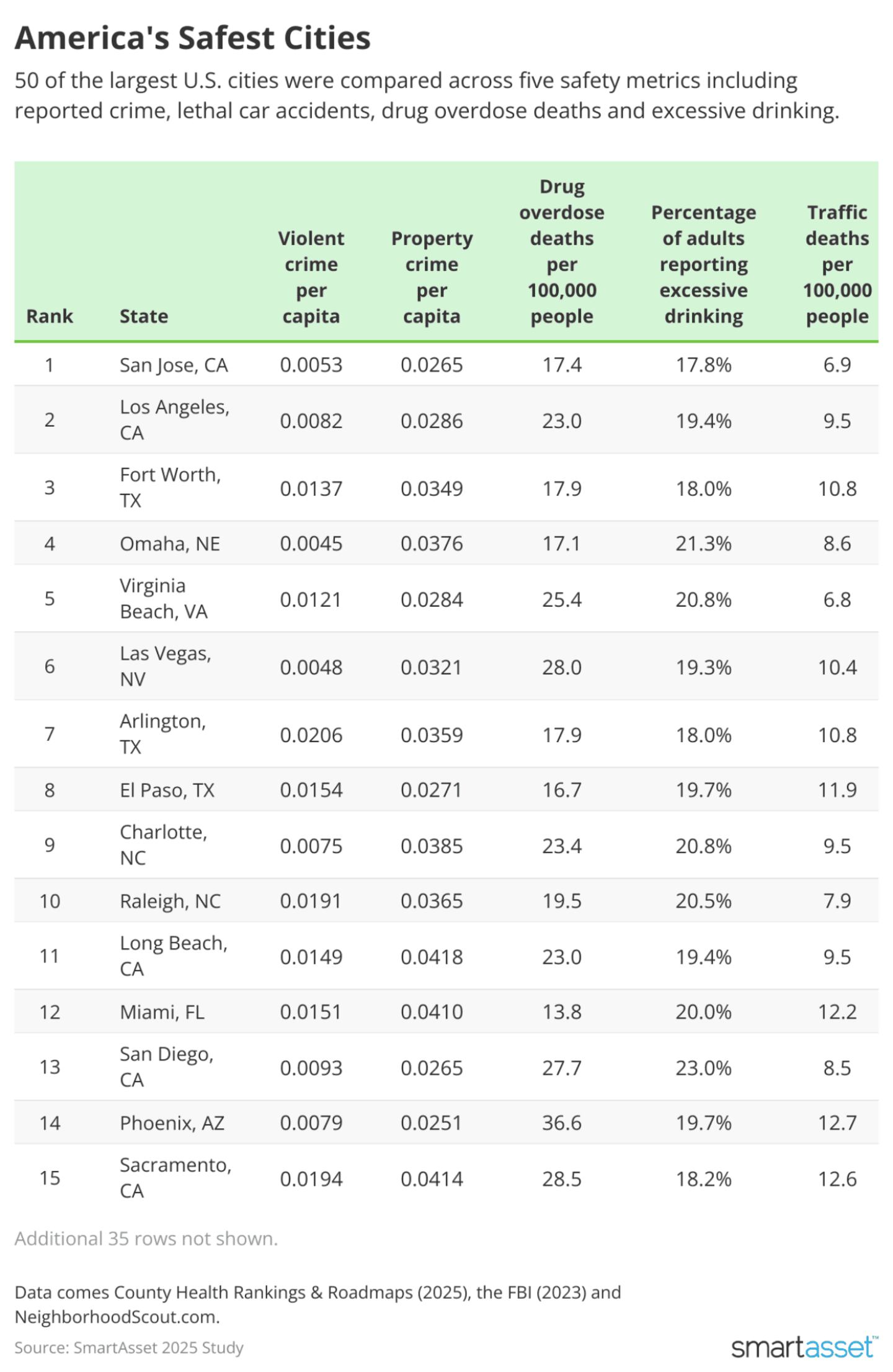 50 of the largest U.S. cities were ranked on five safety metrics on a per-capita basis: violent crime, property crime, fatal car accidents, drug overdose deaths, and excessive drinking. Per capita measures are based on the number of adults aged 18 or older.