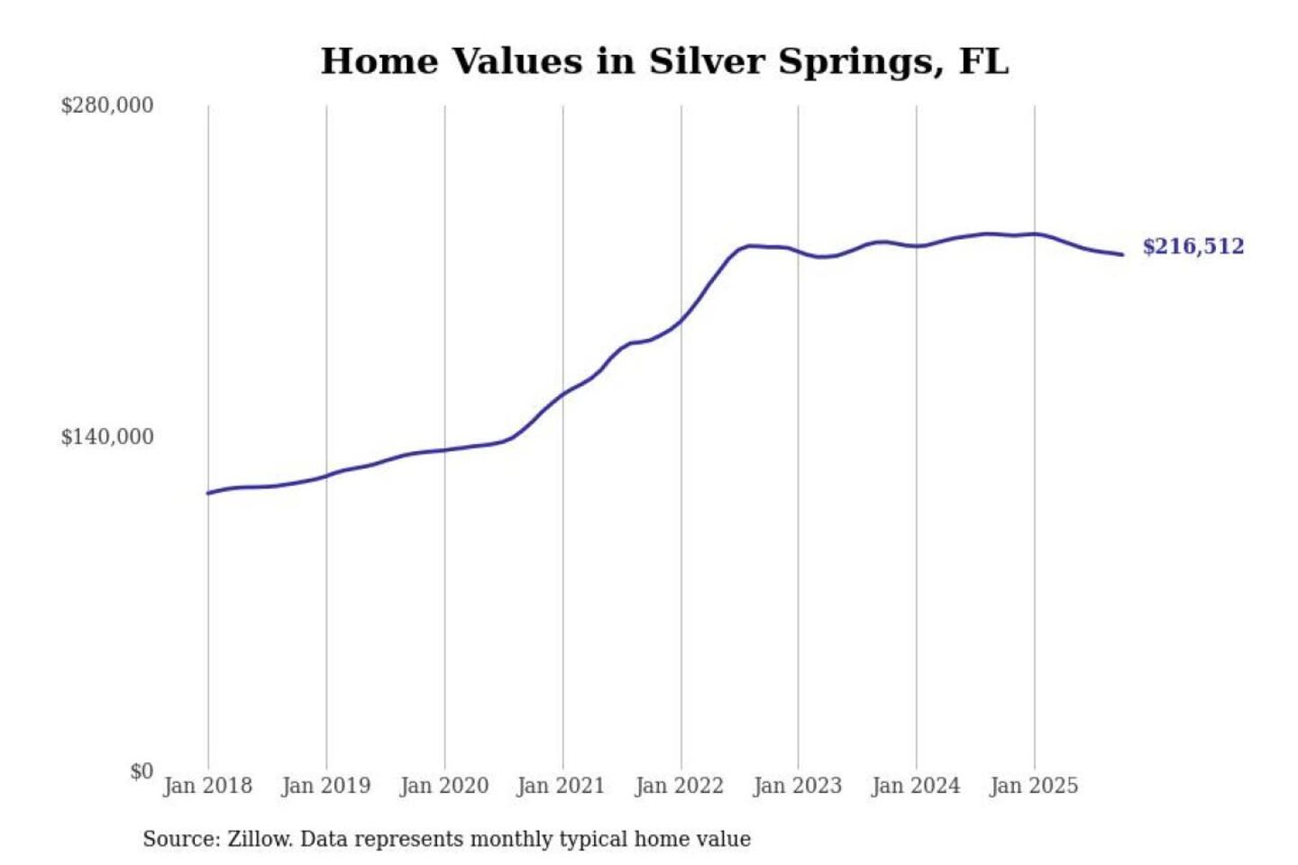 Stacker compiled a list of cities with the most expensive homes in the Ocala, FL metro area using data from Zillow. Charts show the monthly typical home value since January 2018.