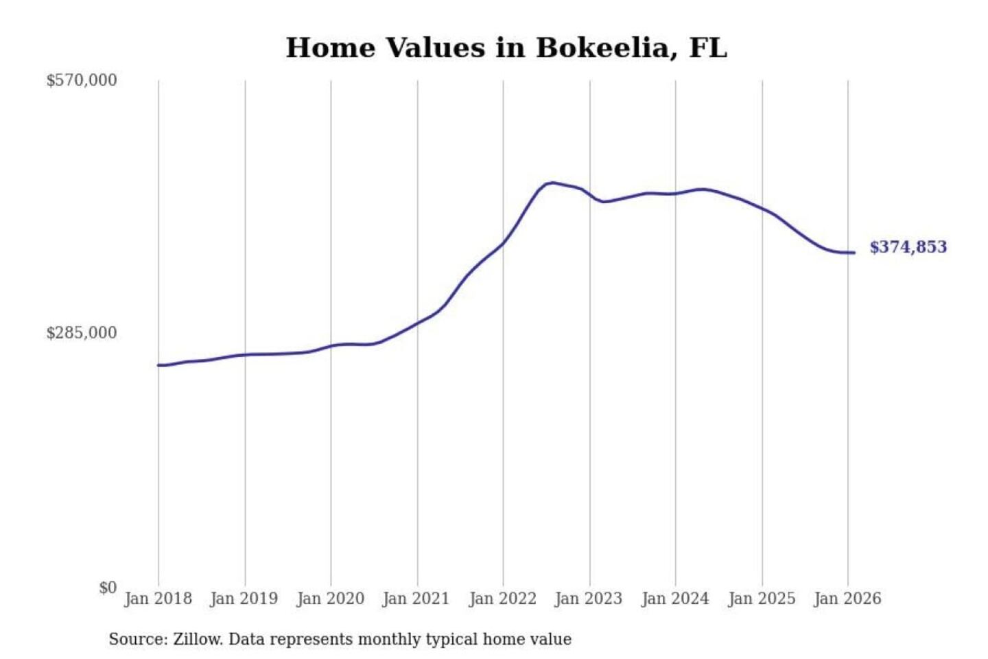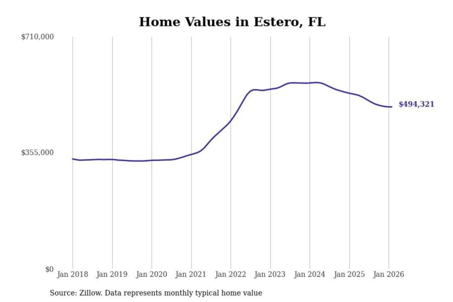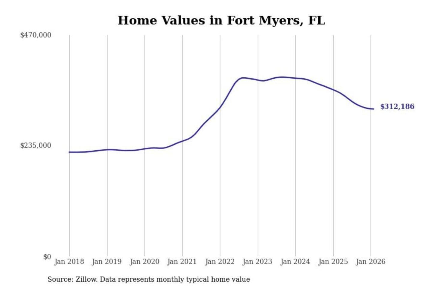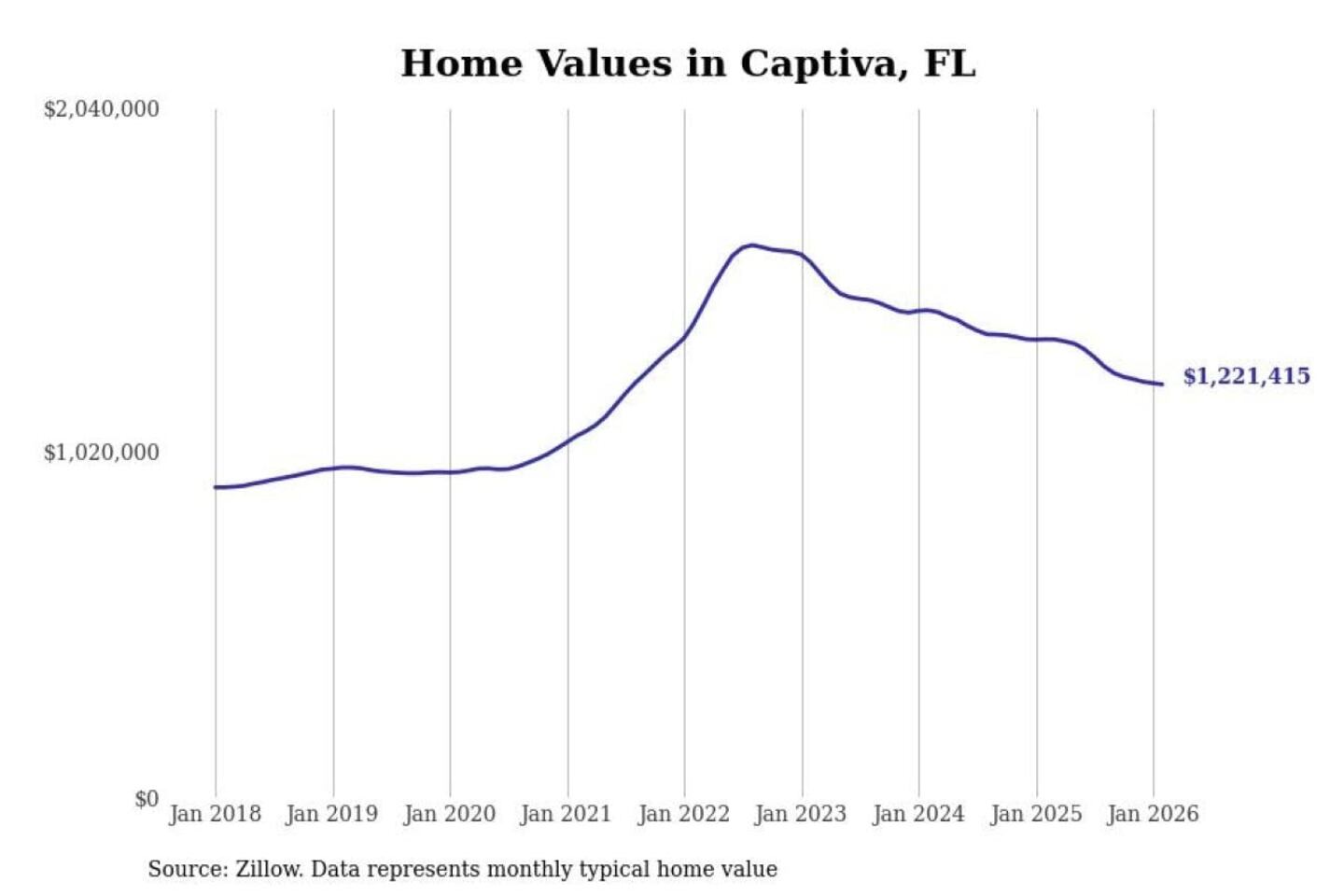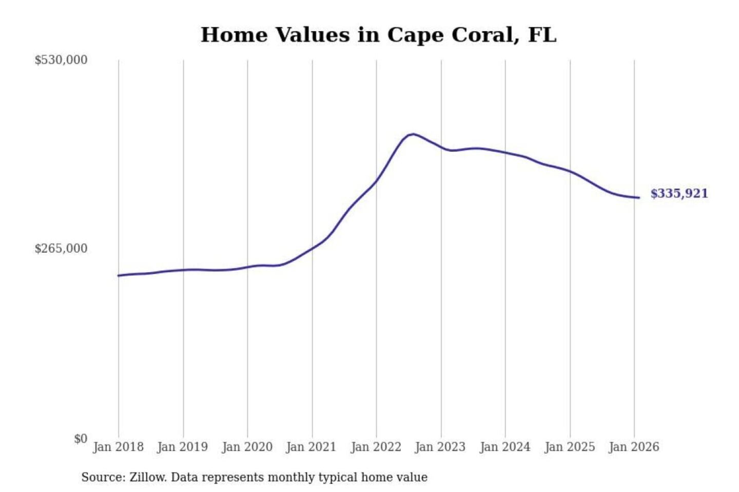 Stacker compiled a list of cities with the most expensive homes in the Cape Coral-Fort Myers, FL metro area using data from Zillow. Charts show the monthly typical home value since January 2018.