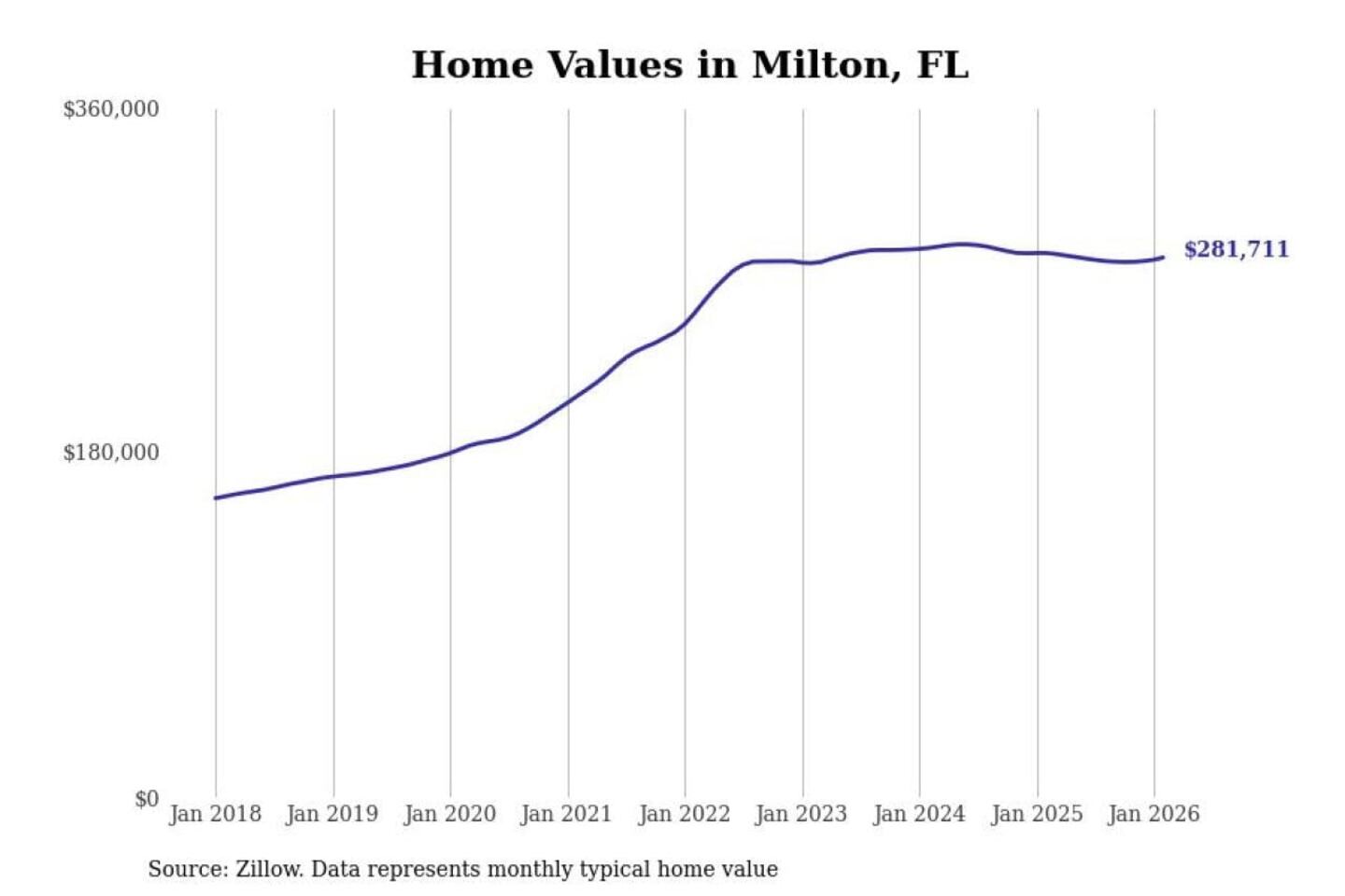 Stacker compiled a list of cities with the most expensive homes in the Pensacola-Ferry Pass-Brent, FL metro area using data from Zillow. Charts show the monthly typical home value since January 2018.