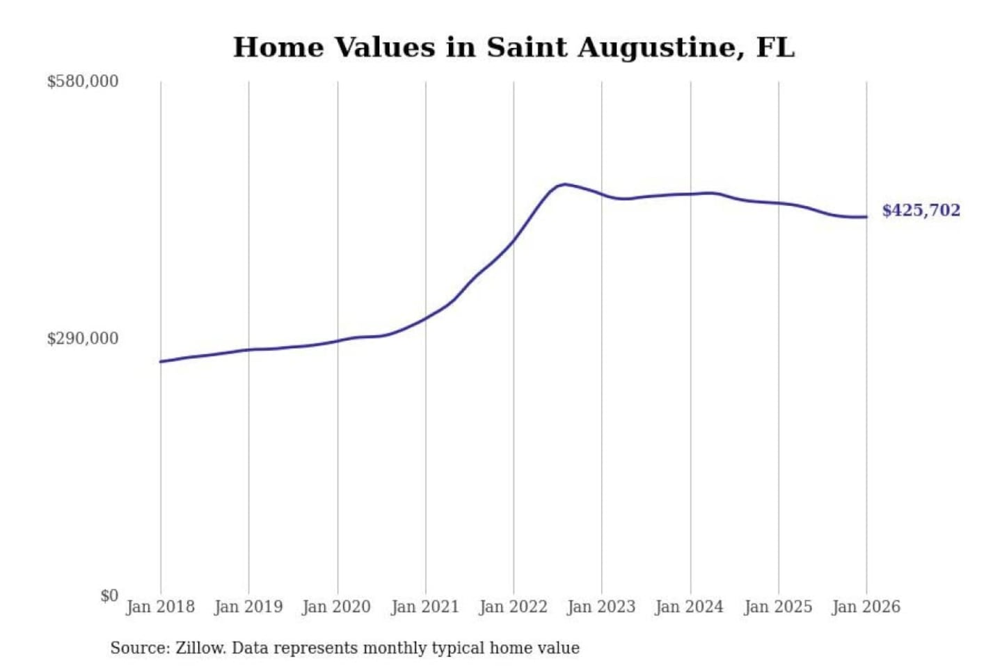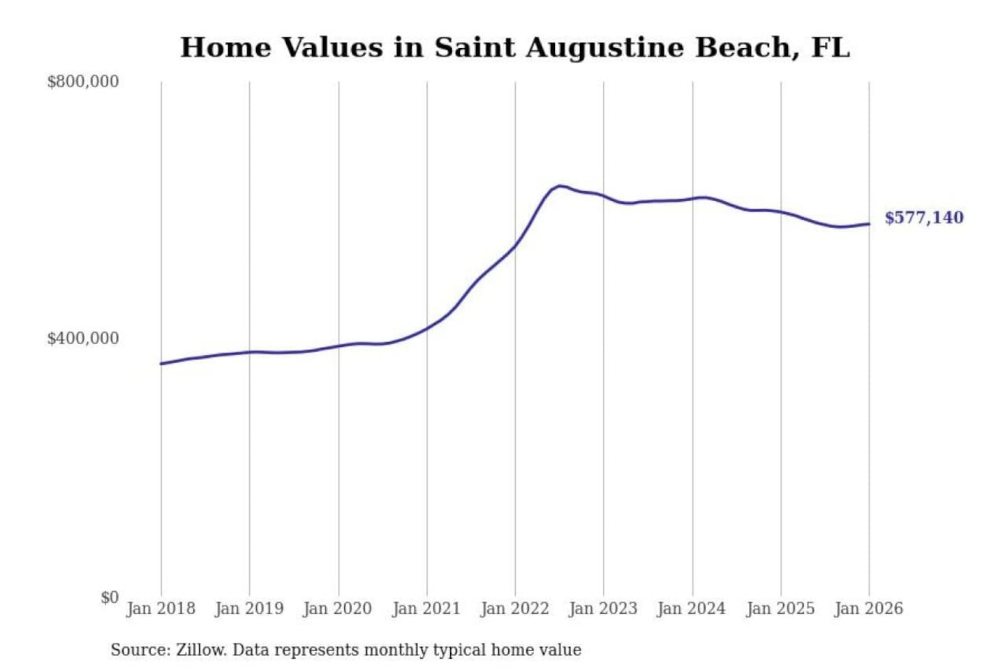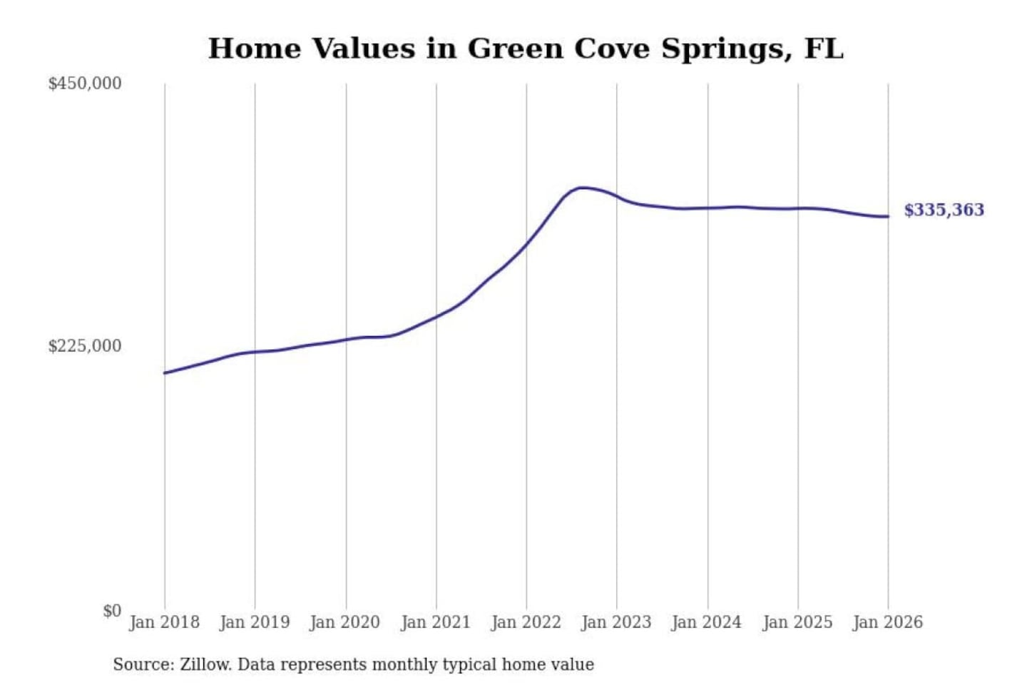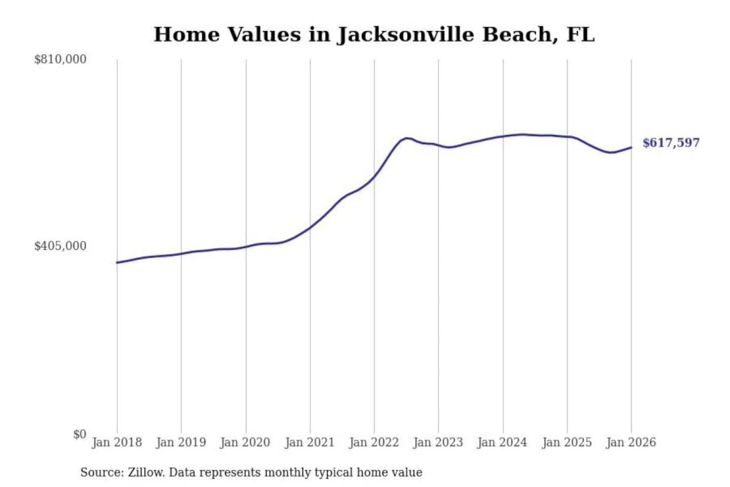 Stacker compiled a list of cities with the most expensive homes in the Jacksonville, FL metro area using data from Zillow. Charts show the monthly typical home value since January 2018.