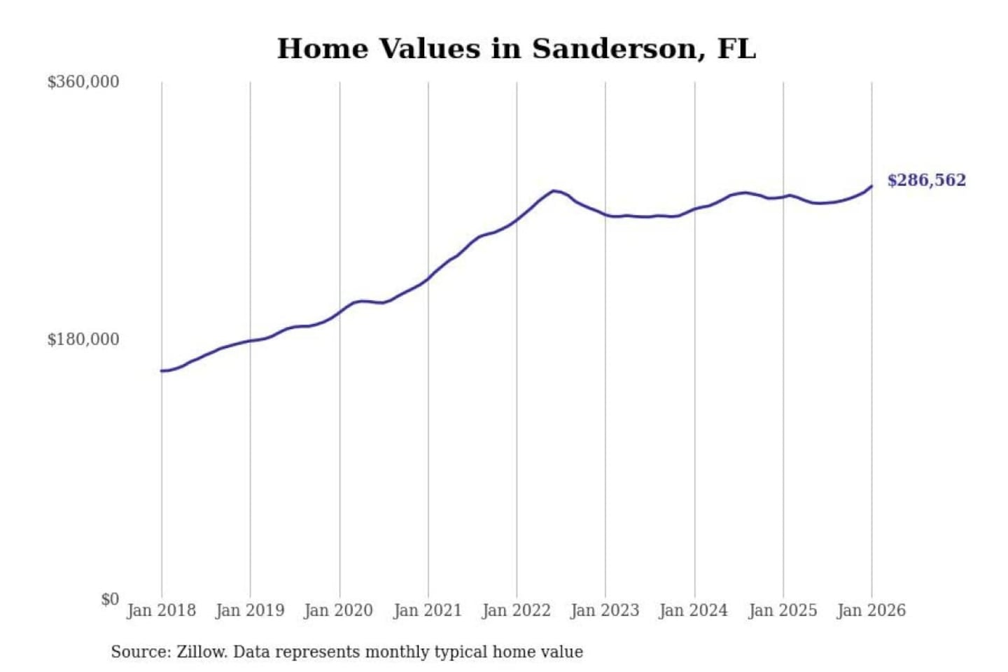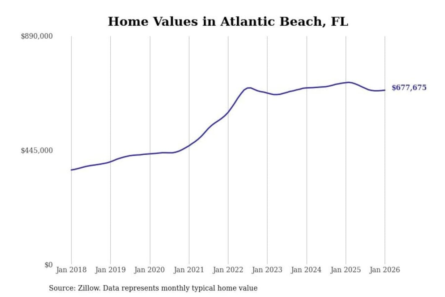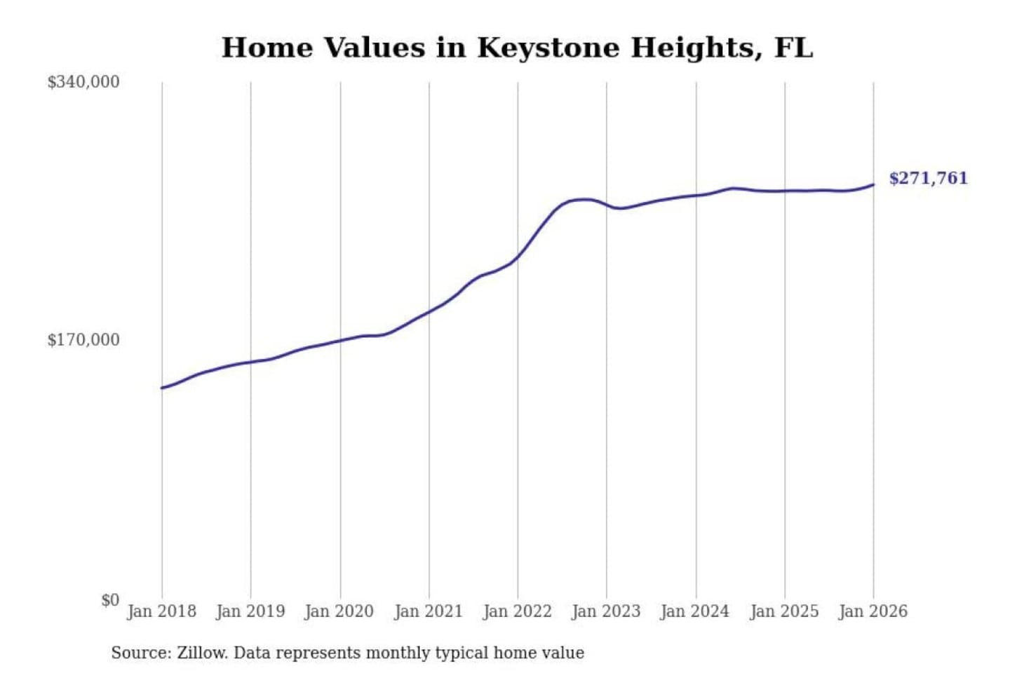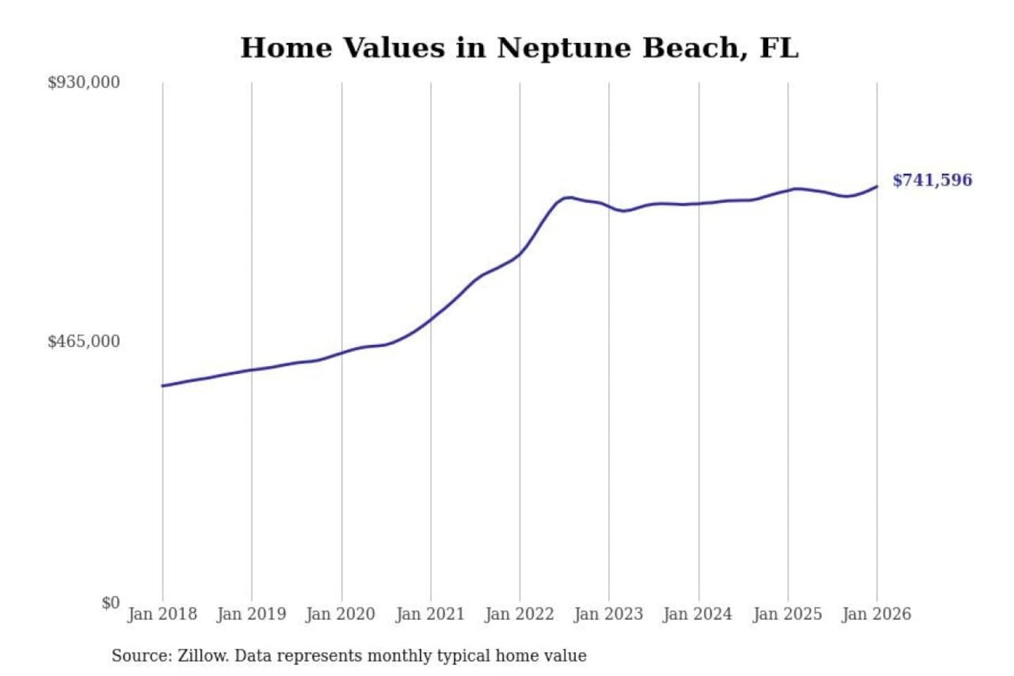 Stacker compiled a list of cities with the most expensive homes in the Jacksonville, FL metro area using data from Zillow. Charts show the monthly typical home value since January 2018.