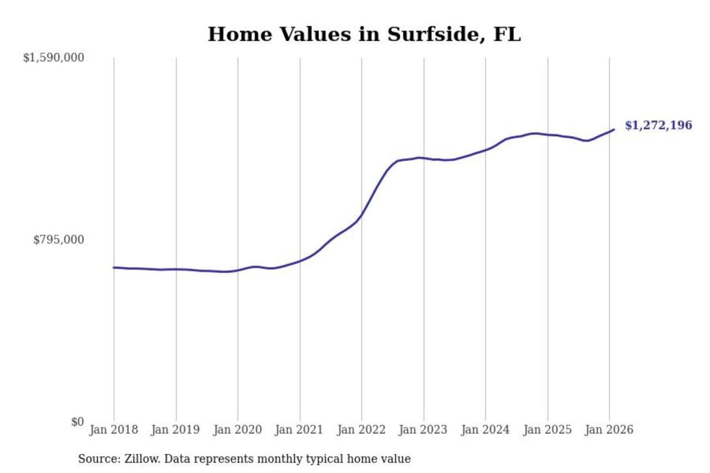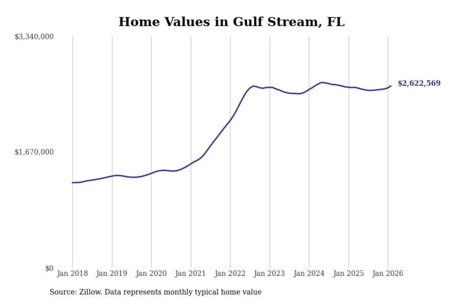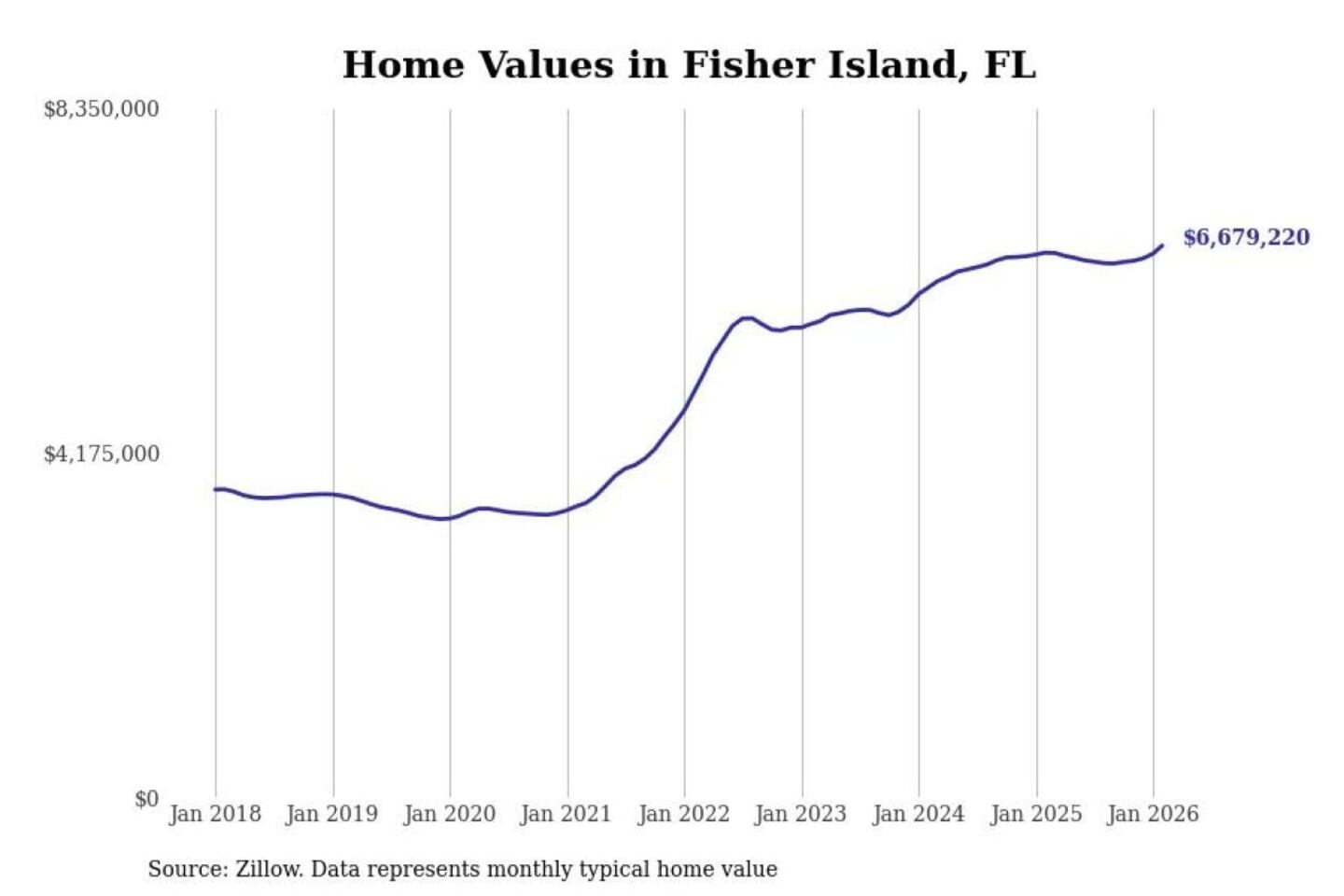 Stacker compiled a list of cities with the most expensive homes in the Miami-Fort Lauderdale-Pompano Beach, FL metro area using data from Zillow. Charts show the monthly typical home value since January 2018.