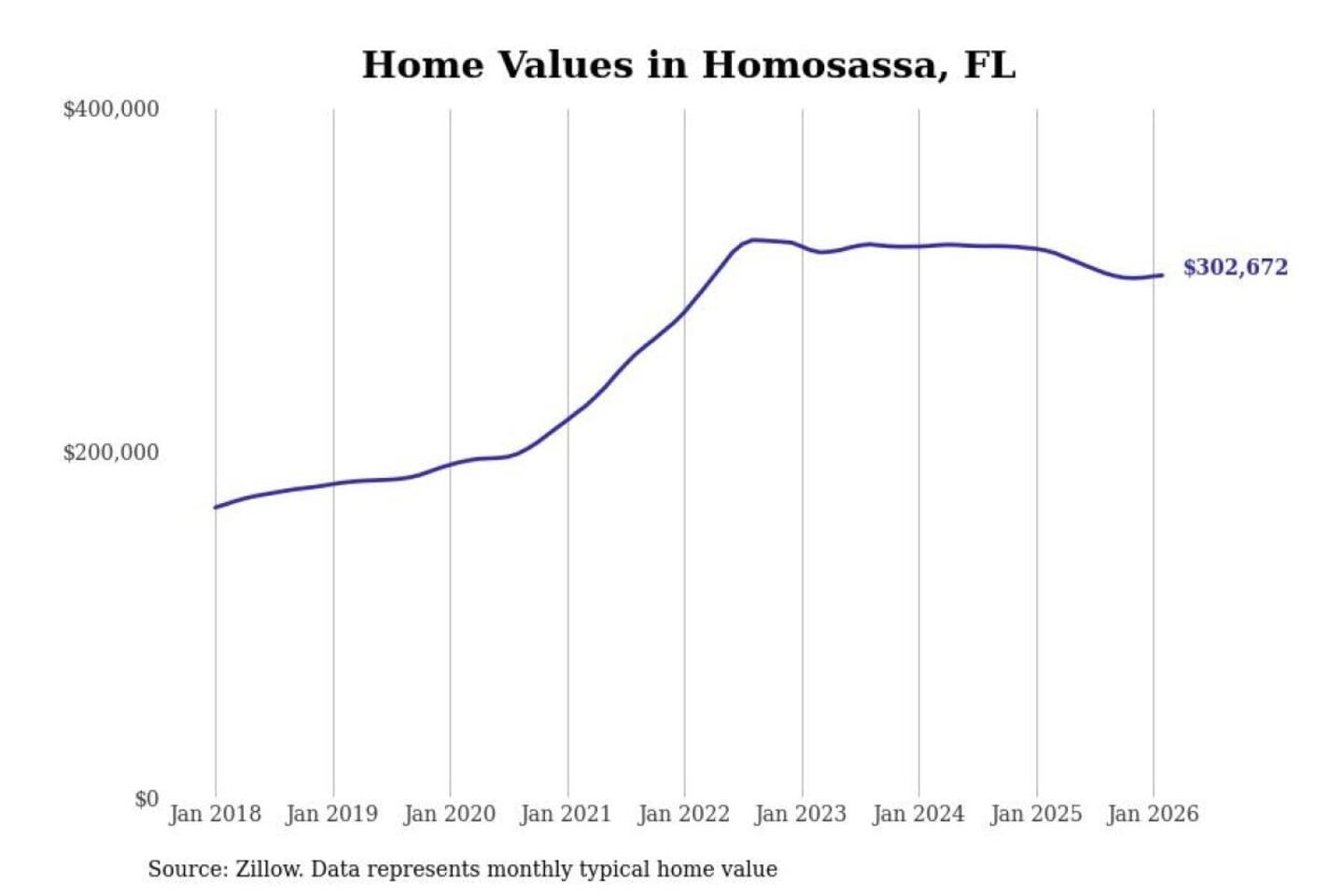 Stacker compiled a list of cities with the most expensive homes in the Homosassa Springs, FL metro area using data from Zillow. Charts show the monthly typical home value since January 2018.