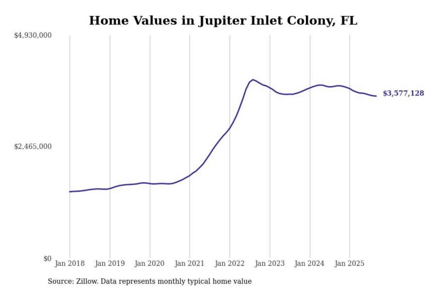 Stacker compiled a list of cities with the most expensive homes in Florida using data from Zillow. Cities are ranked by the Zillow Home Values Index for all homes as of October 2025. The charts in this story were created automatically using Matplotlib.
