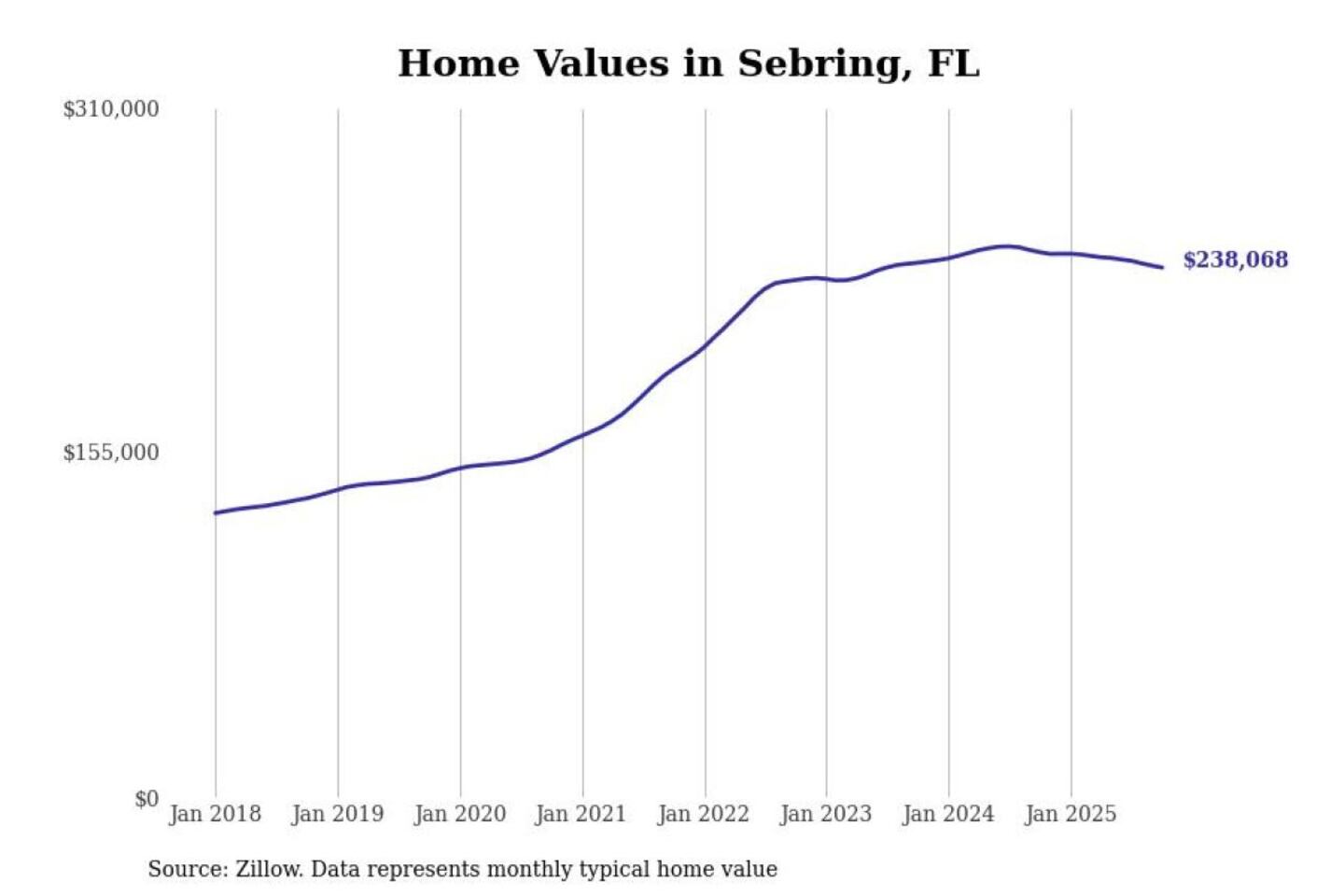 Stacker compiled a list of cities with the most expensive homes in the Sebring metro area using data from Zillow. Charts show the monthly typical home value since January 2018. All 5 cities and towns with data available were included in the list.