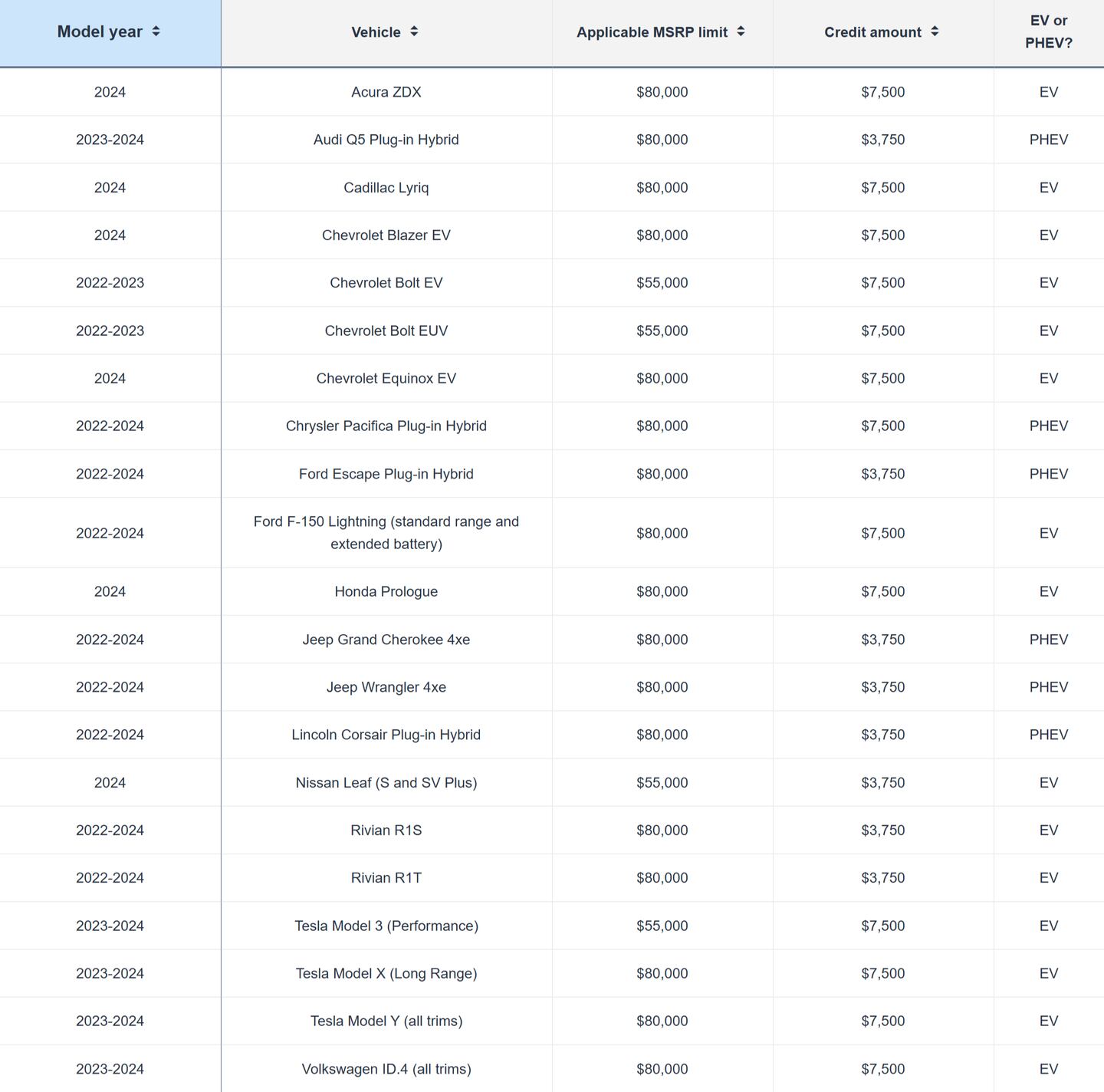 List of 2024 Eligible Vehicles