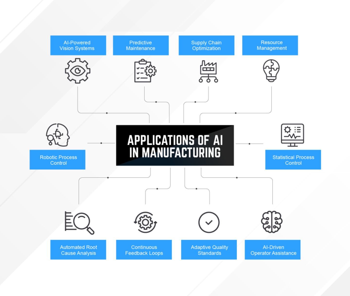 AI applications drive physical actions through robotics, optimize workflow with intelligent decision-making, and help manufacturers better manage materials, energy, and labor.