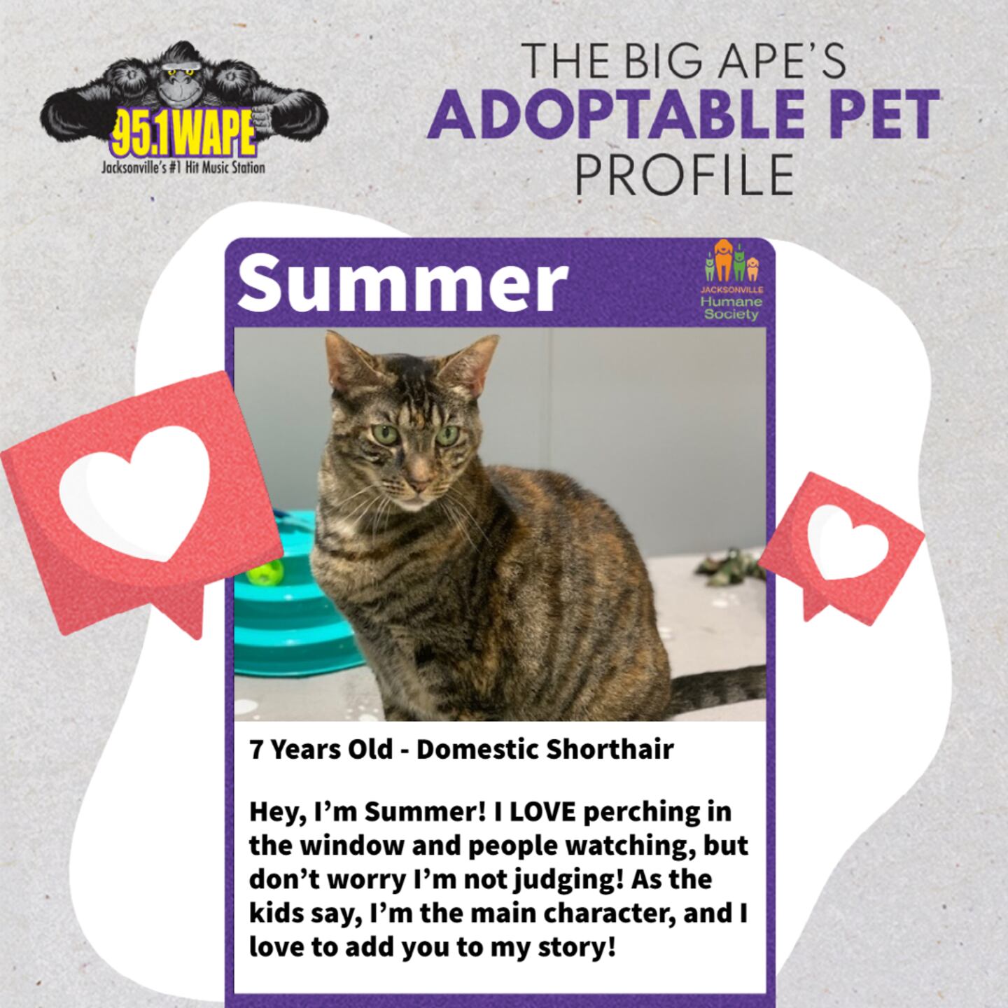 This is Summer, a 7-Year-old chill cat that loves people watching. Summer is available at the Jacksonville Humane Society.
