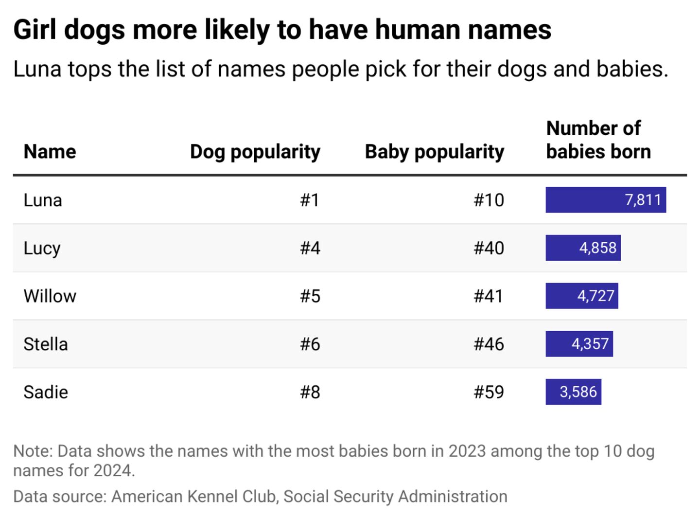 Of the top 100 names for girl dogs, 98 appeared on the Social Security Administration's list of popular baby girl names. (The only exceptions were Mocha and Cookie). Among the most popular crossover names were Luna, Lucy, Willow, Stella, and Sadie.