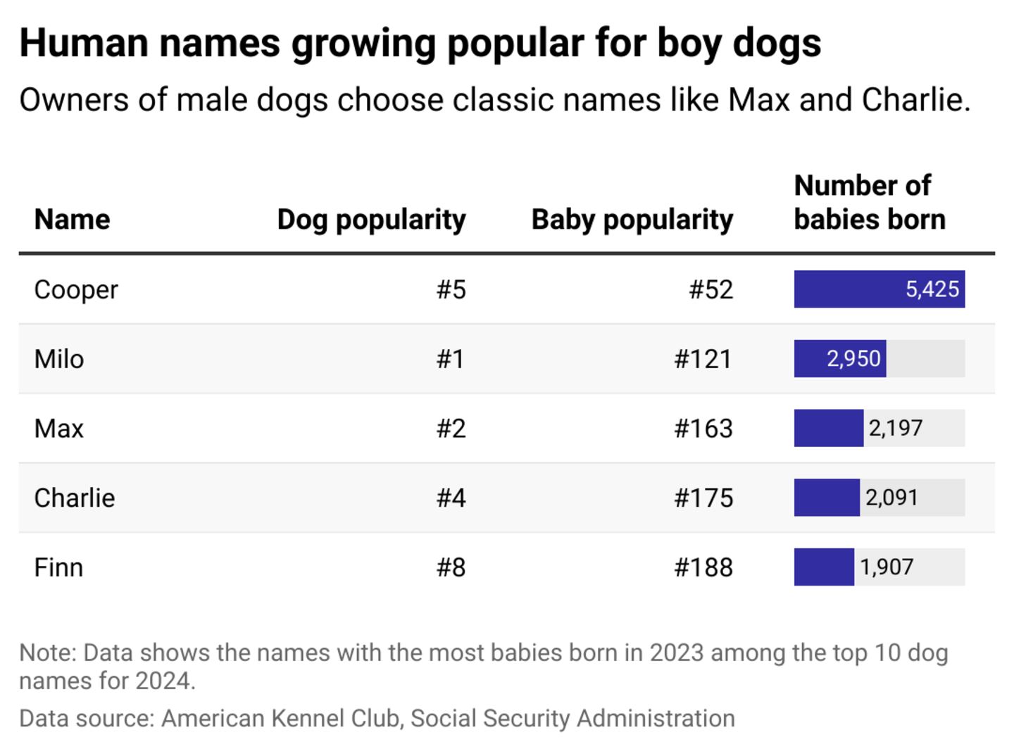 Of the top 100 names for boy dogs, 92 appeared on the SSA's list of popular boy names. (Exceptions include Moose, Smokey, Tank, Whiskey, Oreo, Bandit, Goose, and Coco).