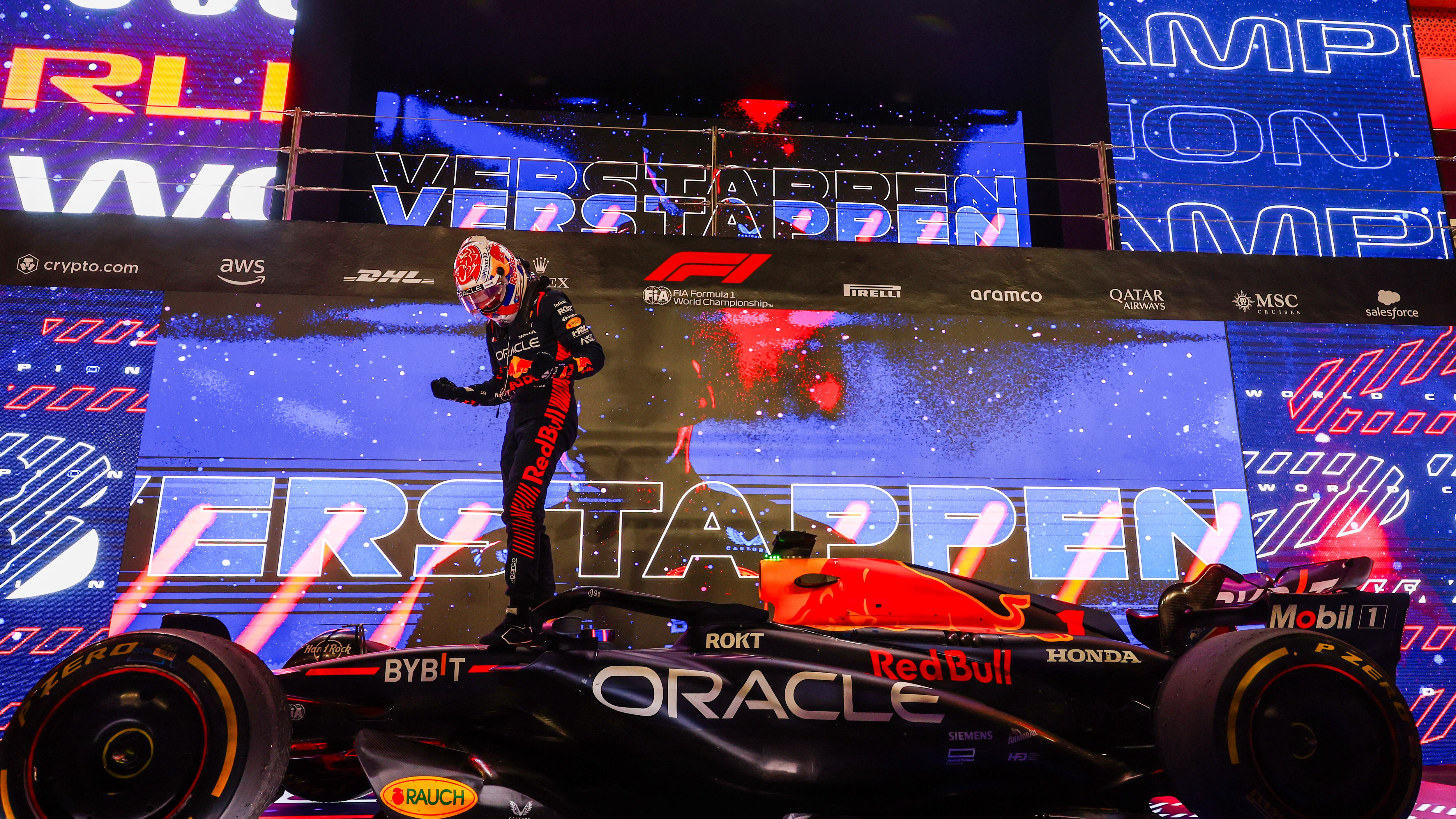 F1 Grand Prix of Qatar - Sprint LUSAIL CITY, QATAR - OCTOBER 07: 2023 F1 World Drivers Champion Max Verstappen of the Netherlands and Oracle Red Bull Racing celebrates on his car in parc ferme after the Sprint ahead of the F1 Grand Prix of Qatar at Lusail International Circuit on October 07, 2023 in Lusail City, Qatar. (Photo by Mark Thompson/Getty Images) (Mark Thompson/Getty Images)