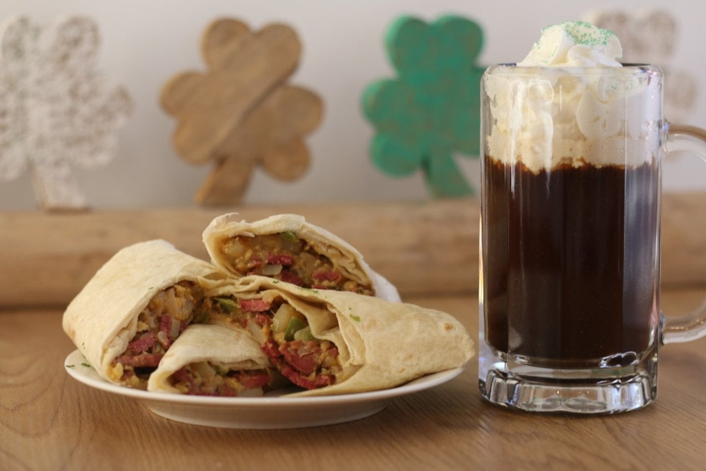 Pair your corned beef hash breakfast burrito with Irish coffee. Simply combine hot coffee with two shots of your favorite Irish whiskey, and top with whipped cream.