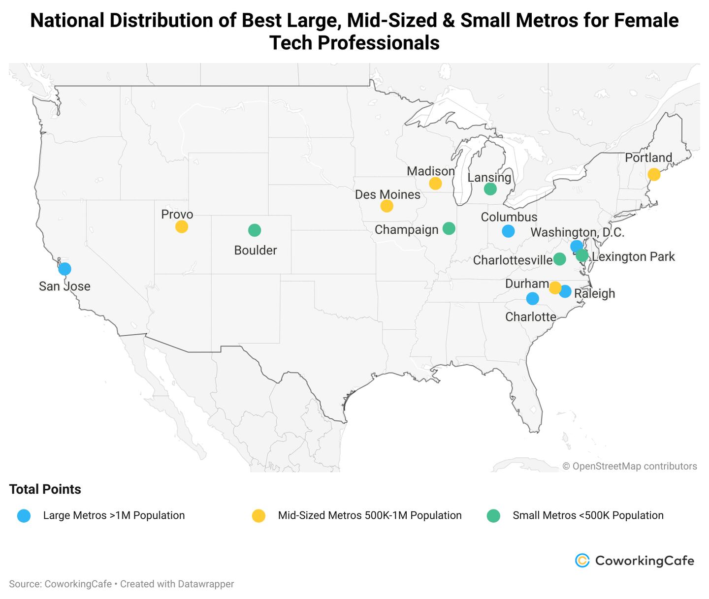 The scoring system behind CoworkingCafe's annual Women in Tech series compares metro areas based on: the share of female workers in the local tech workforce; their earnings, unemployment and health insurance coverage rates; as well as broader metrics that gauge the broader professional landscape. However, to get a better perspective, the more than 200 metros in this analysis were divided into three population brackets—large, mid-sized and small.
