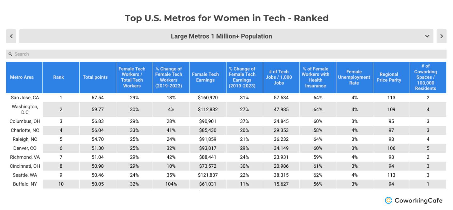 Emerging as a rising tech hub in the Midwest, Columbus, Ohio, continues to gain traction as an attractive destination for women in tech. In fact, Columbus leaped 10 positions in the ranking to settle into third place. With 29% of tech jobs held by women, the metro is making steady progress in gender representation within the industry. This surge has been driven by major investments from Amazon, Intel, and Google, which are transforming the metro into an emerging tech hub and fueling demand for highly skilled talent.