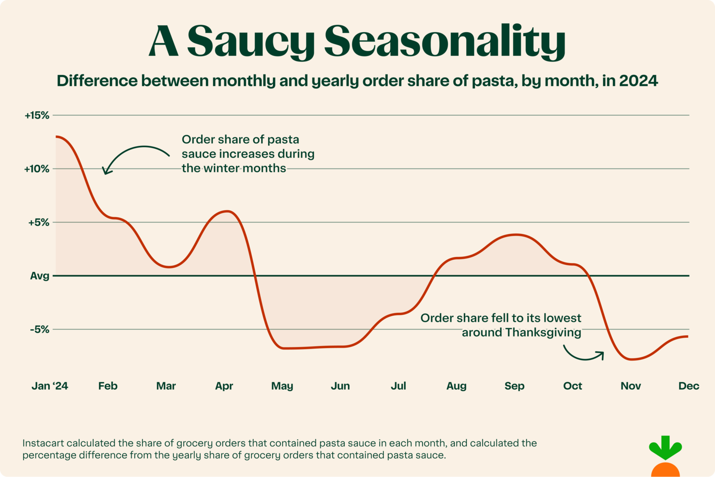 Pasta sauce preferences follow the seasons, with demand spiking in the chilly winter months and tapering off in summer. The cold weather fuels cravings, as January saw pasta sauce orders at their highest.