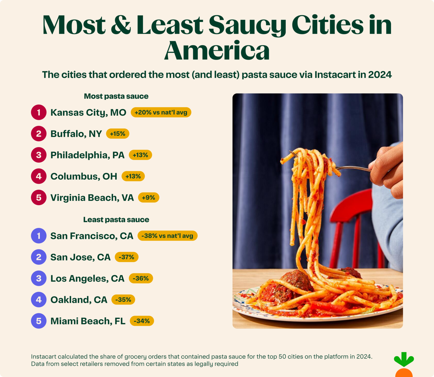 Kansas City, MO isn't just about barbecue—it also took the top spot in pasta sauce purchases, ordering 20% more often than the national average. On the other end of the spectrum, foodie-filled San Francisco ordered pasta sauce the least, at 37% below the national average.