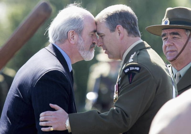 Through the years Prince Andrew, Duke of York (R), gets a Maori greeting (Hongi) from the Minister of Defence Hon. Mark Burton during a Powhiri (welcome) and reviewing the parade at Linton Army base September 29, 2005 in Palmerston North, New Zealand. The Duke of York is in Palmerston North as part of a 5 day visit to New Zealand. (Photo by Marty Melville/Getty Images) (Getty Images/Getty Images)
