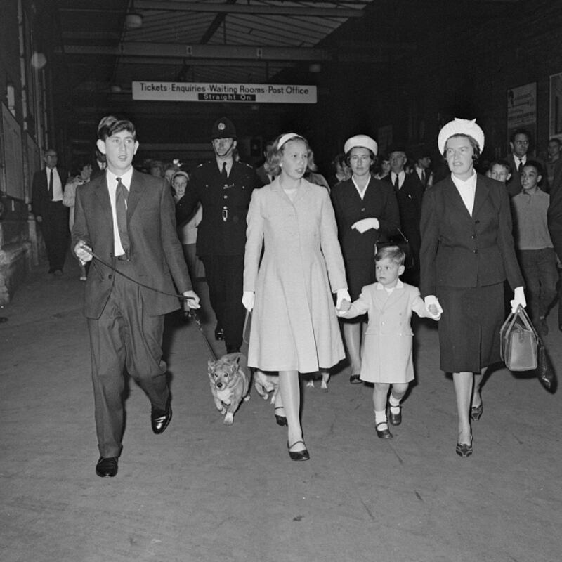 Through the years Prince Charles, walking a Corgi, Princess Anne, Prince Andrew and their nanny Mabel Anderson at Euston Station, London, UK, 8th August 1963. (Photo by Daily Express/Hulton Archive/Getty Images) (Express/Getty Images)