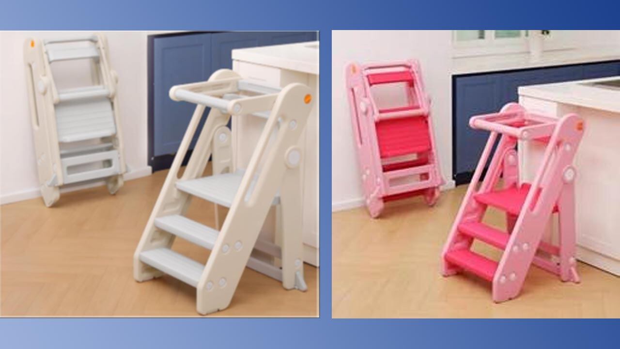The Consumer Product Safety Commission said the Onasti toddler tower stools were sold in beige /white, blue/gray, green, gray/white, light blue and pink. They are 25 inches long, 24 inches wide and 32 inches tall. They have handles and adjustable platforms.