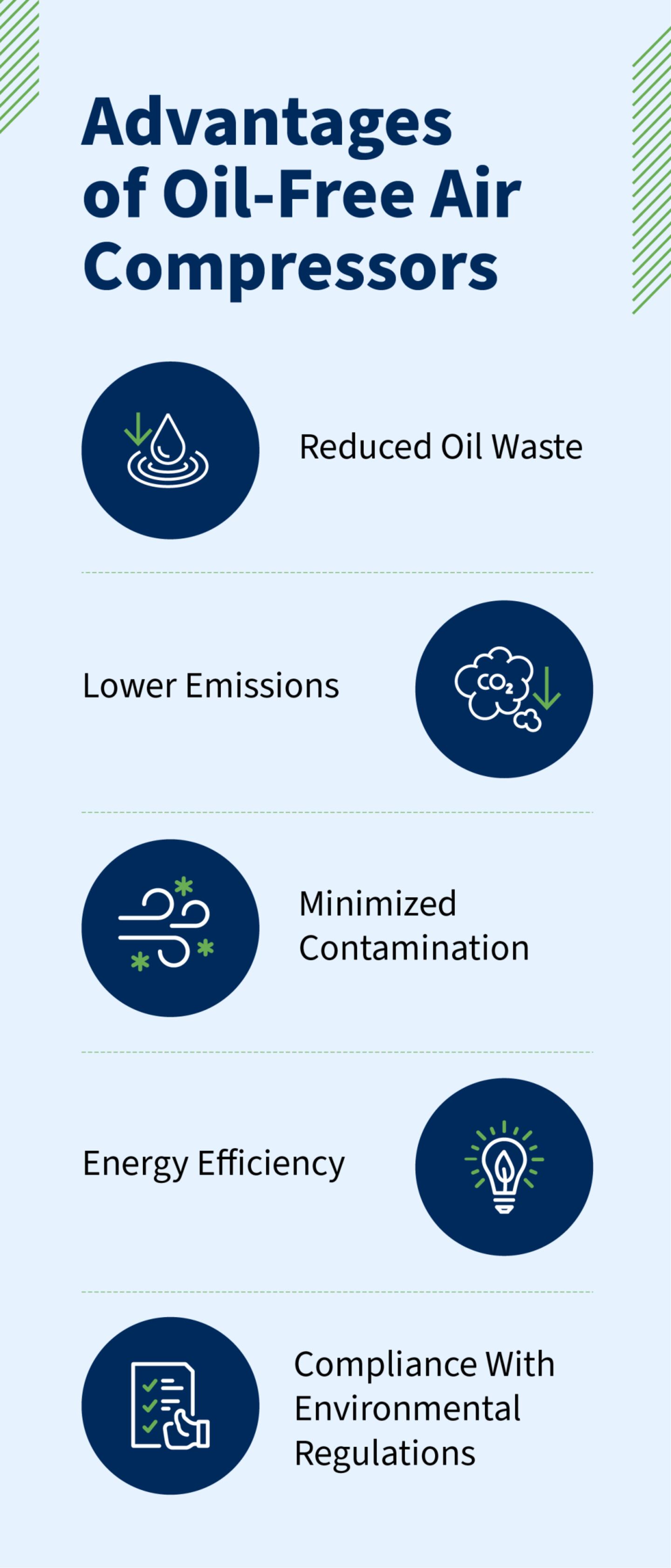 There are many environmental benefits to using oil-free air compressors over traditional oil-lubricated models.