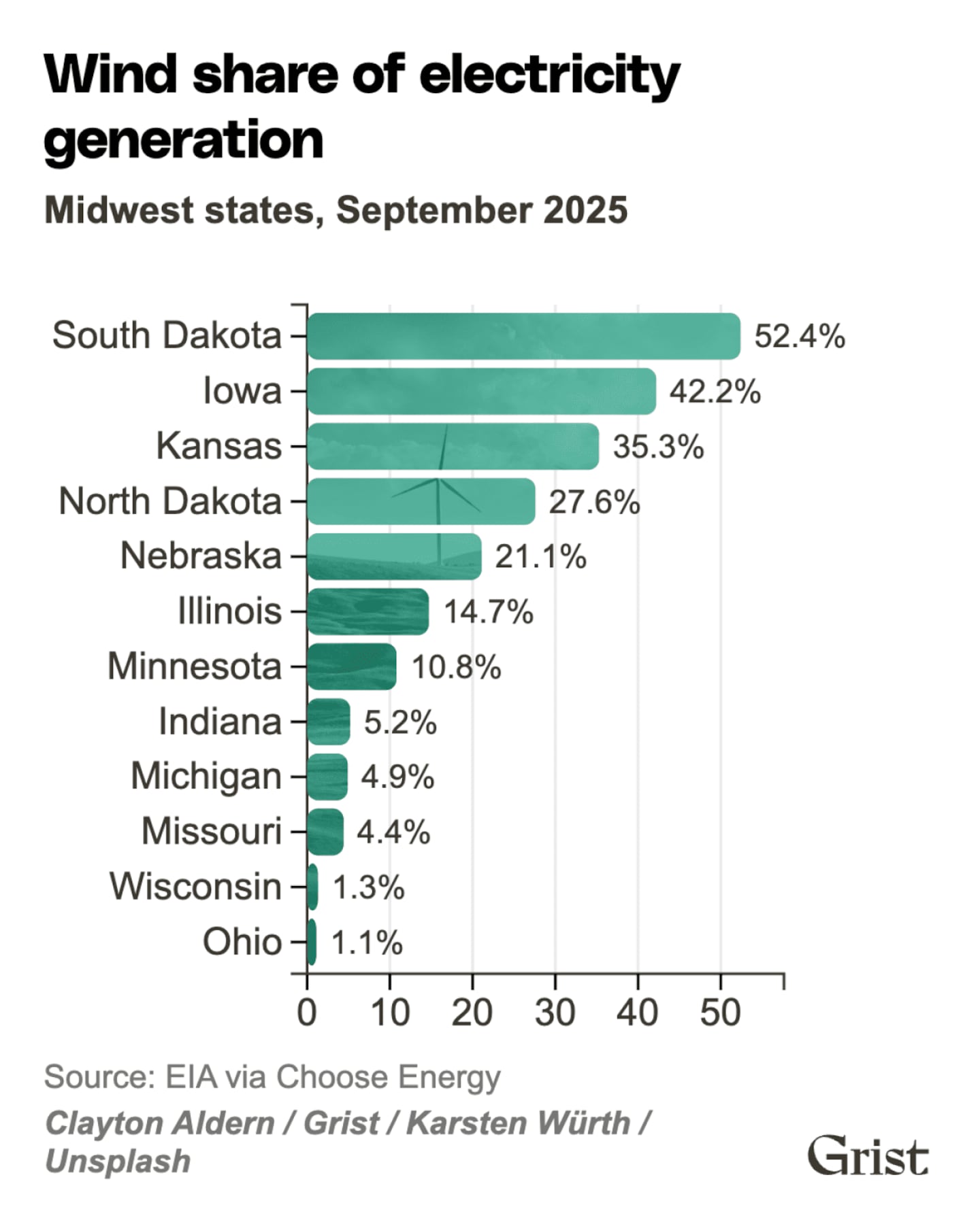 This stability is largely a renewable energy success story: Many Midwestern states are now deeply reliant on wind power. Wind supplies more than 40% of electricity in Iowa and South Dakota, and more than 35% in Kansas. Investments in utility-scale wind and solar have helped shield consumers from price shocks tied to natural gas volatility, since renewables have no fuel costs and can reduce exposure to sudden spikes in gas prices. Research also shows that these investments can lower wholesale electricity prices by displacing higher-cost generation during periods of high wind and solar output.