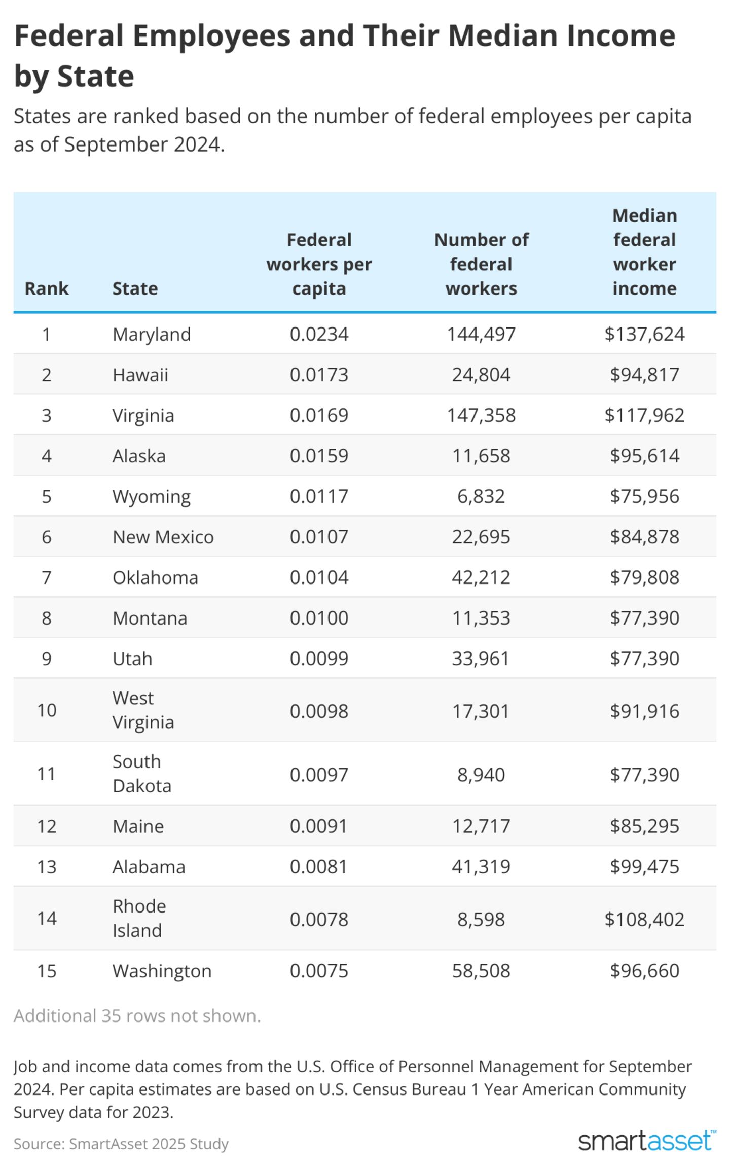 • Maryland has the most federal workers per capitaand the highest paid. As of September 2024, there were 144,497 federal employees in Maryland, or 0.023 workers per state resident. The median salary for these workers is $137,624, more than any other state.